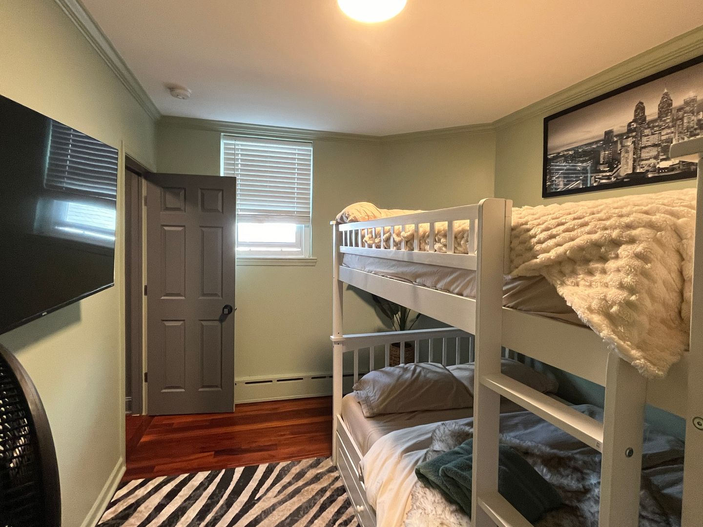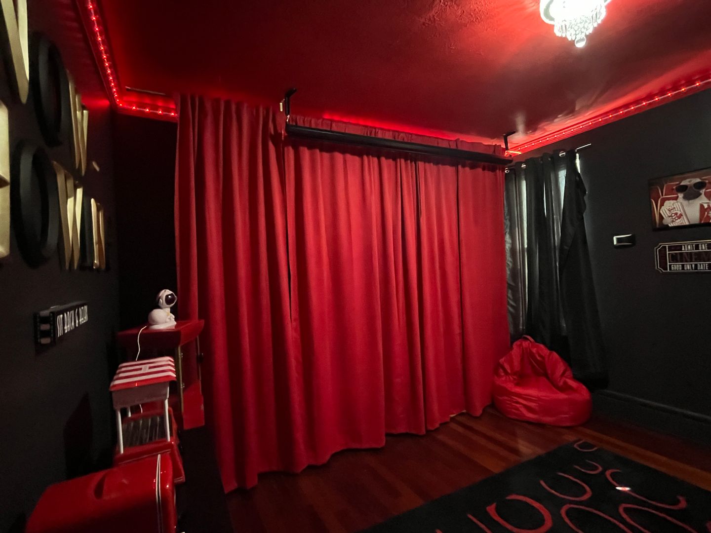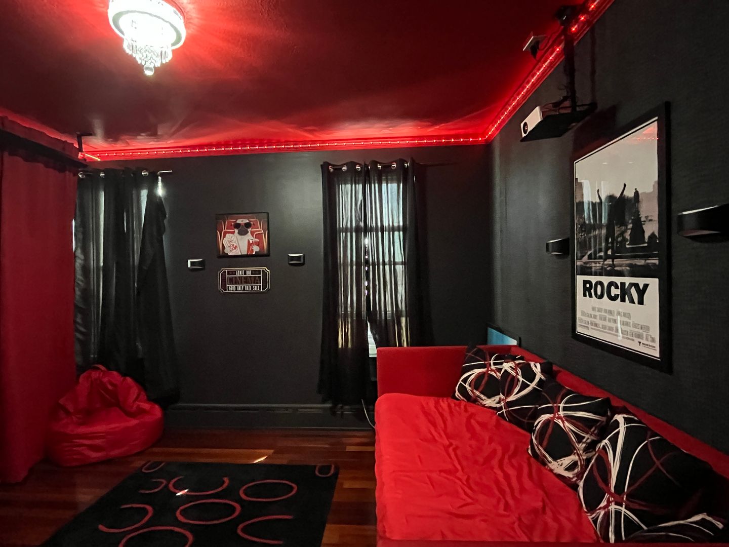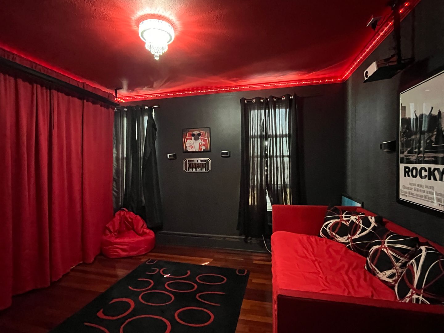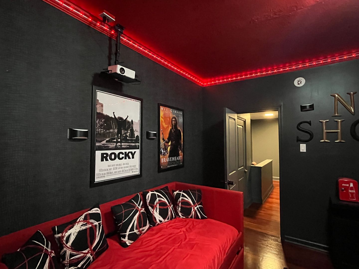 This 3-bedroom, 1 bath gem offers an unbeatable city retreat. With 7 memory foam beds, there's ample room for everyone to Lounge comfortably. Movie enthusiasts will adore the 3rd story movie theater, perfect for cozy nights in. The main living area with its open layout is ideal for relaxation. The Kitchen is very large for your culinary delight, complete with a sprawling Coffee Bar.