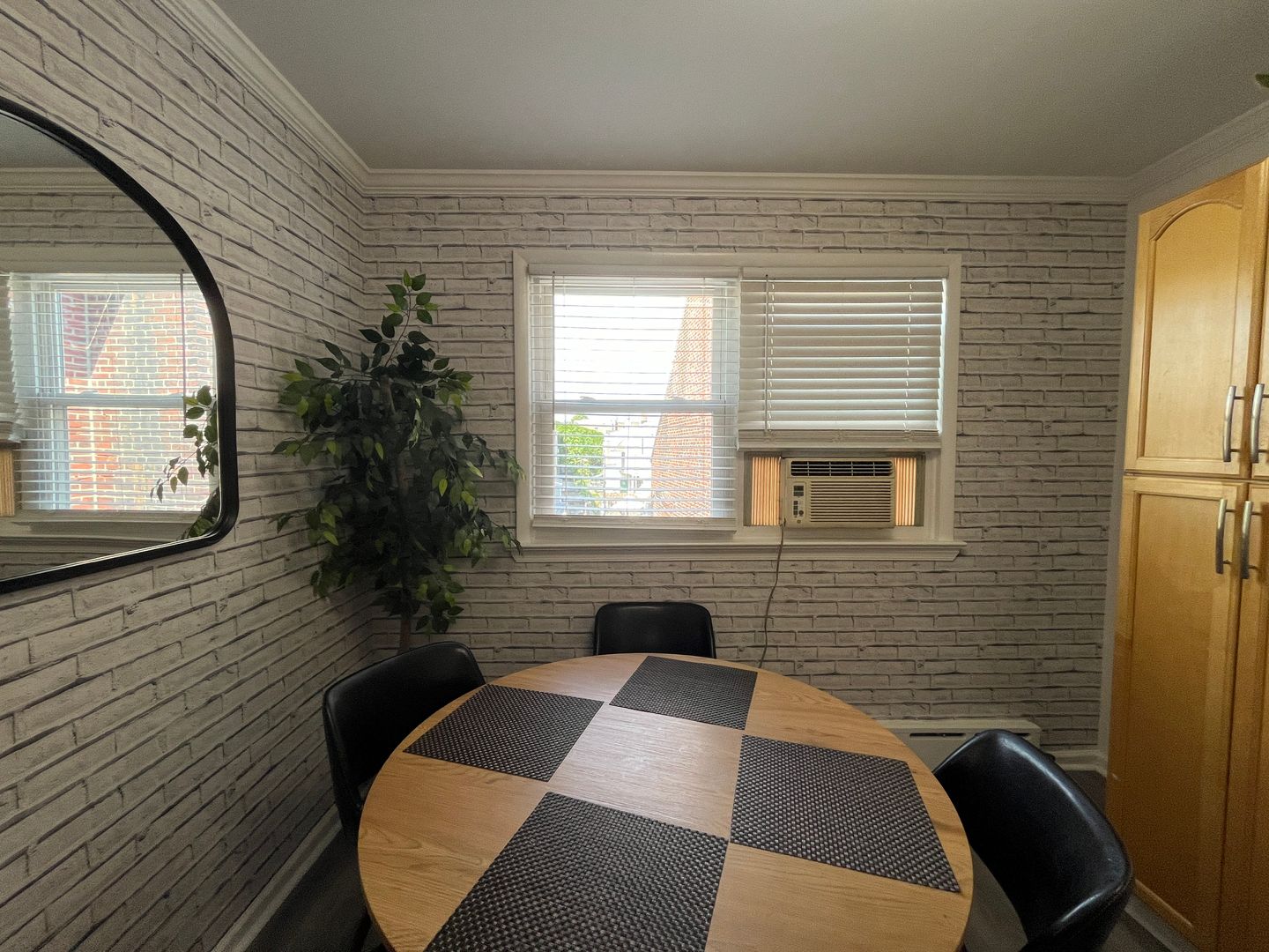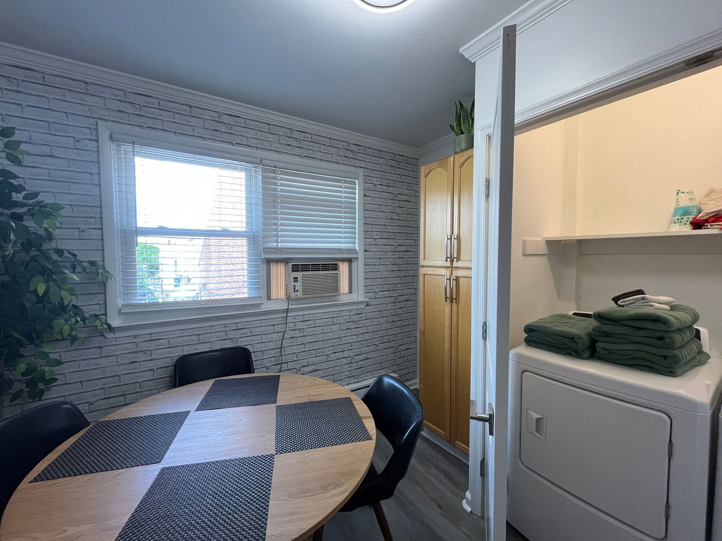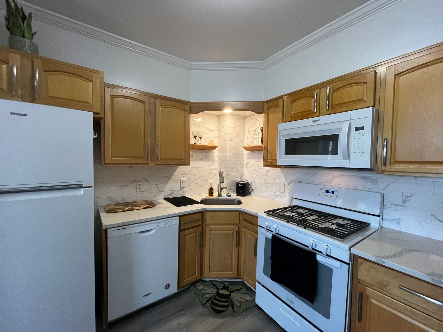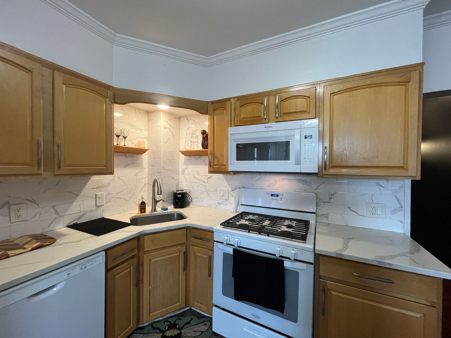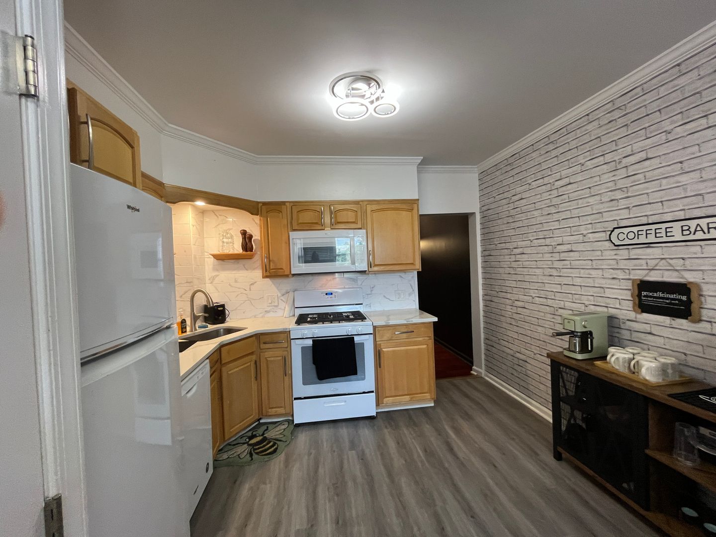 Enter the apartment and head to the huge,newly renovated eat-in kitchen, featuring oak laminate flooring, oak wood cabinets, 2 large light-filled picture windows and newer appliances including refrigerator, gas stove, microwave, dishwasher, garbage disposal and full-sized washer/dryer.