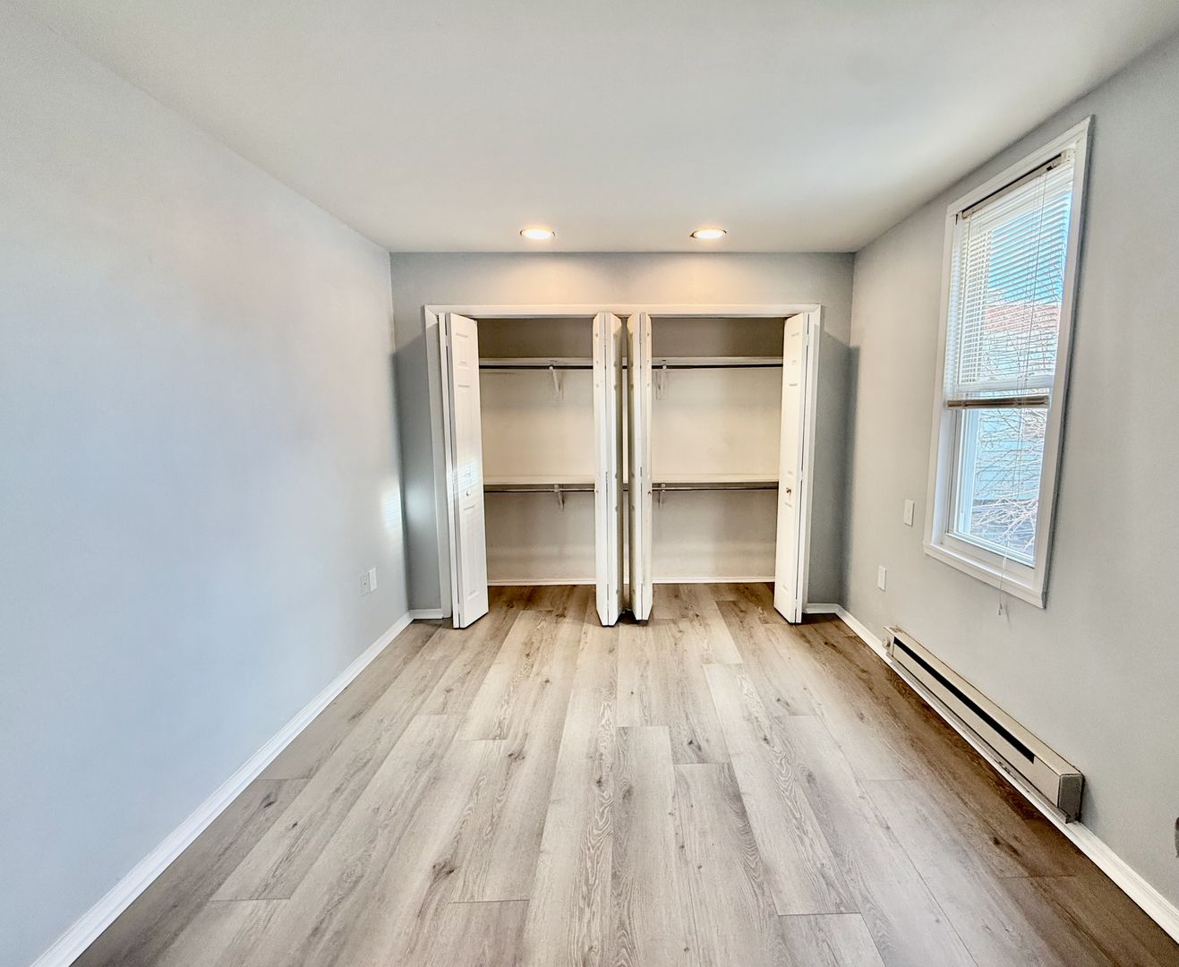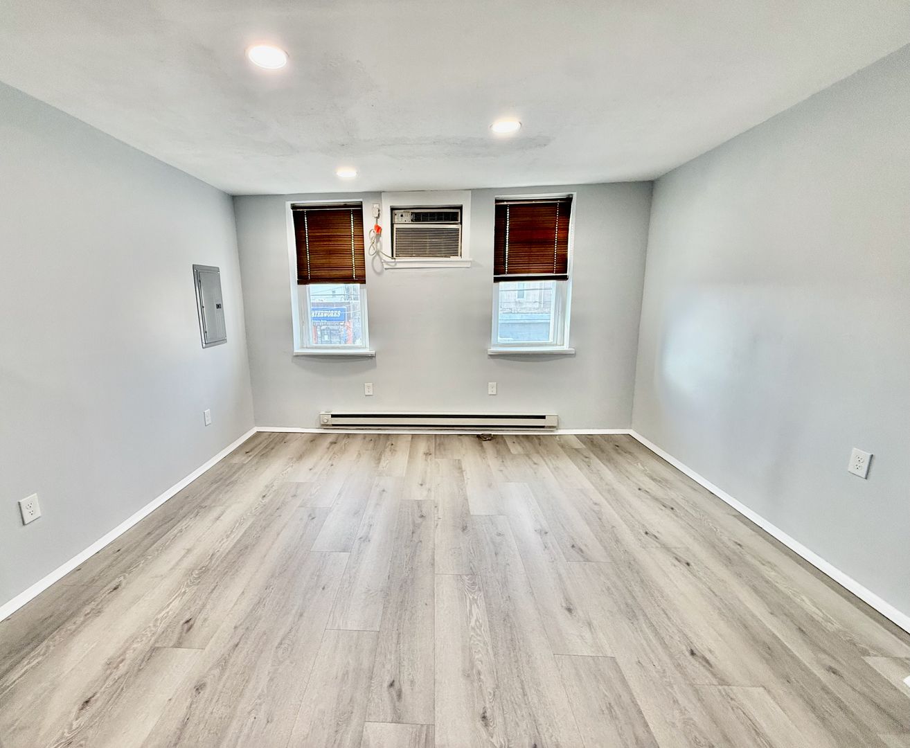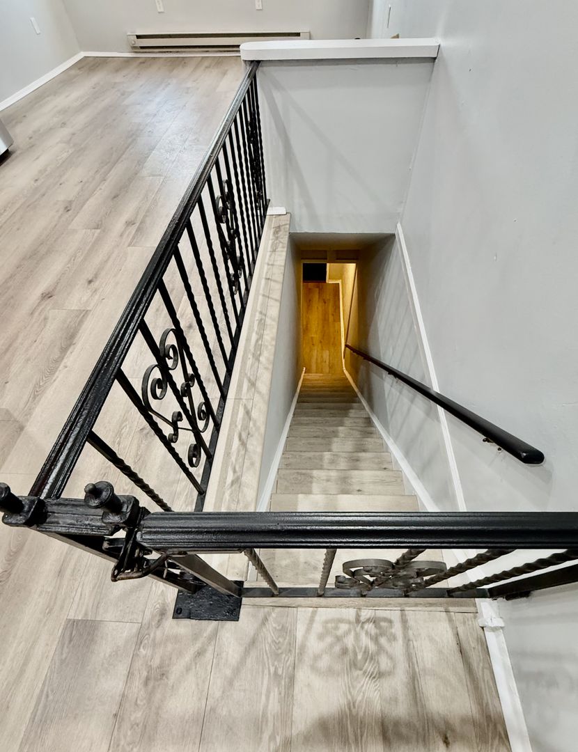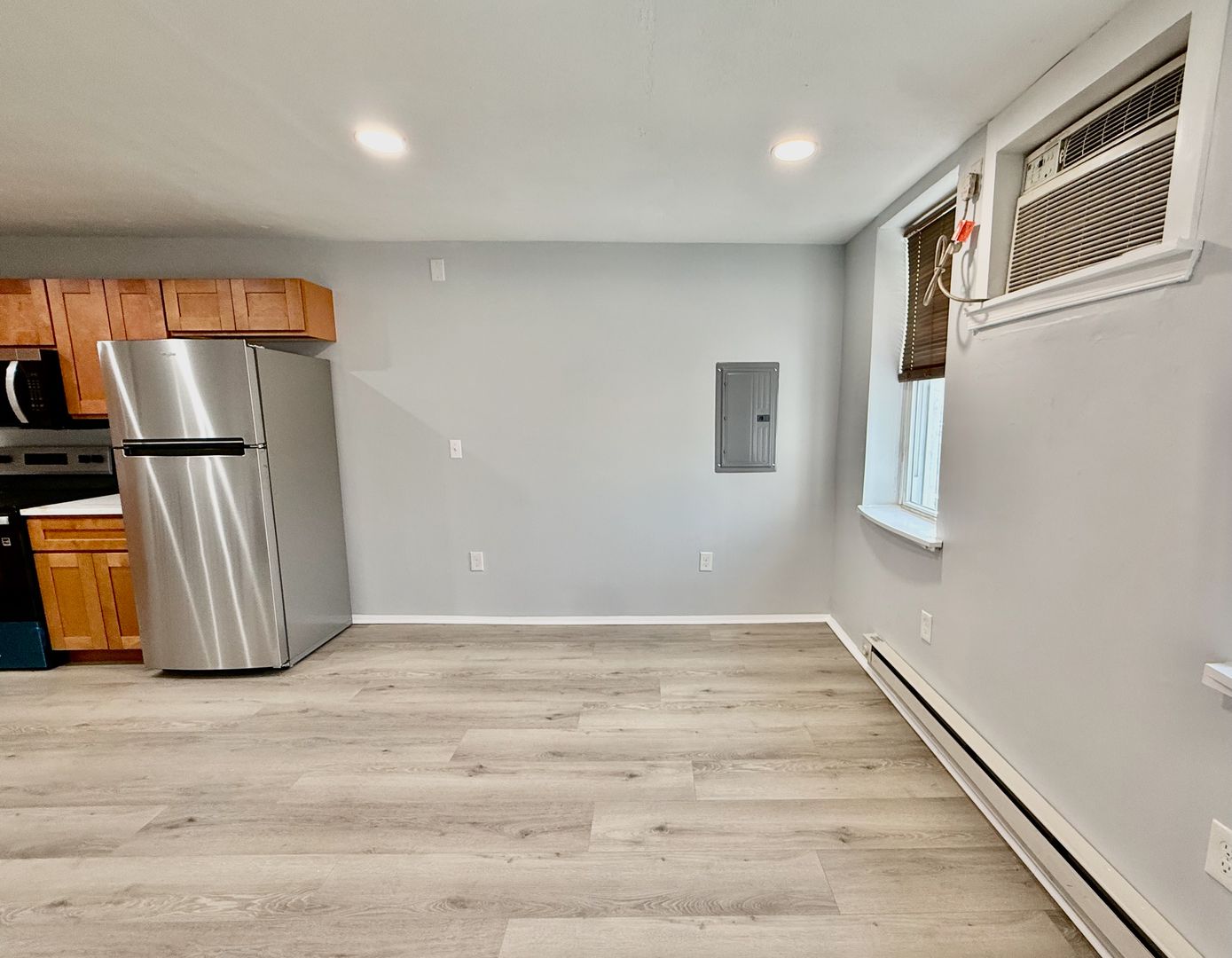 Enter this two unit building, up one flight of stairs to the just renovated, spacious and airy combined living room/dining room & kitchen, freshly painted, with new luxury vinyl flooring throughout, high ceilings, recessed lighting, two large windows with new blinds coming & good natural light, built-in wall ac unit and brand new kitchen featuring quartz countertops, Shaker cabinetry, and Stainless appliances -including refrigerator-electric stove-microwave and undermount sink w/ garbage disposal.