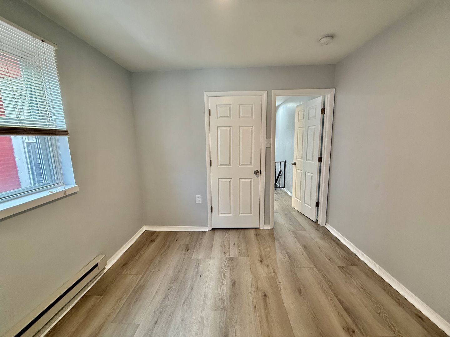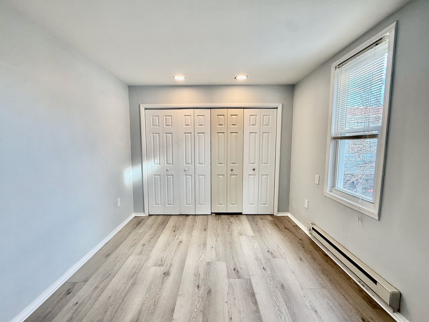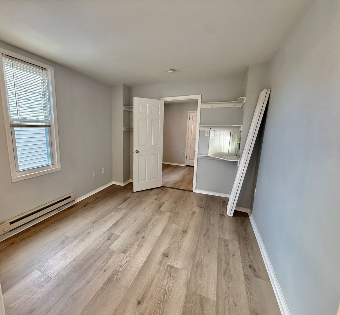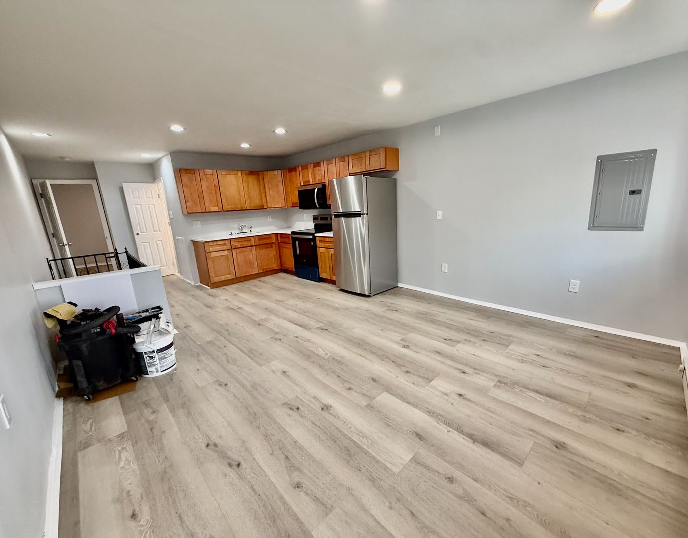 Enter this two unit building, up one flight of stairs to the just renovated, spacious and airy combined living room/dining room & kitchen, freshly painted, with new luxury vinyl flooring throughout, high ceilings, recessed lighting, two large windows with new blinds coming & good natural light, built-in wall ac unit and brand new kitchen featuring quartz countertops, Shaker cabinetry, and Stainless appliances -including refrigerator-electric stove-microwave and undermount sink w/ garbage disposal.