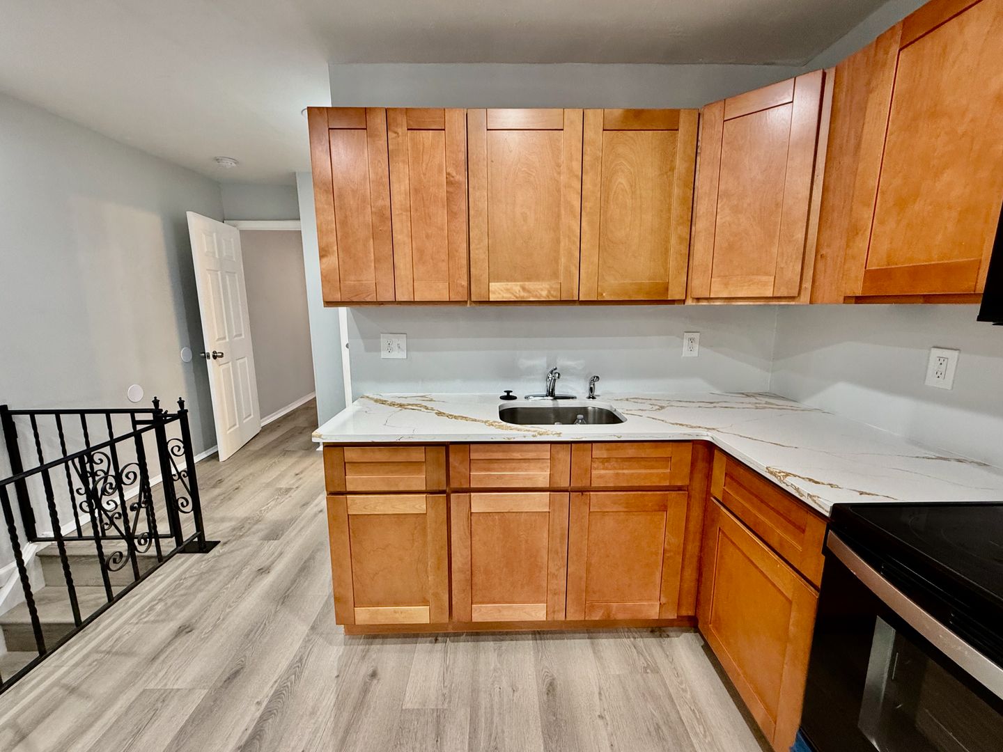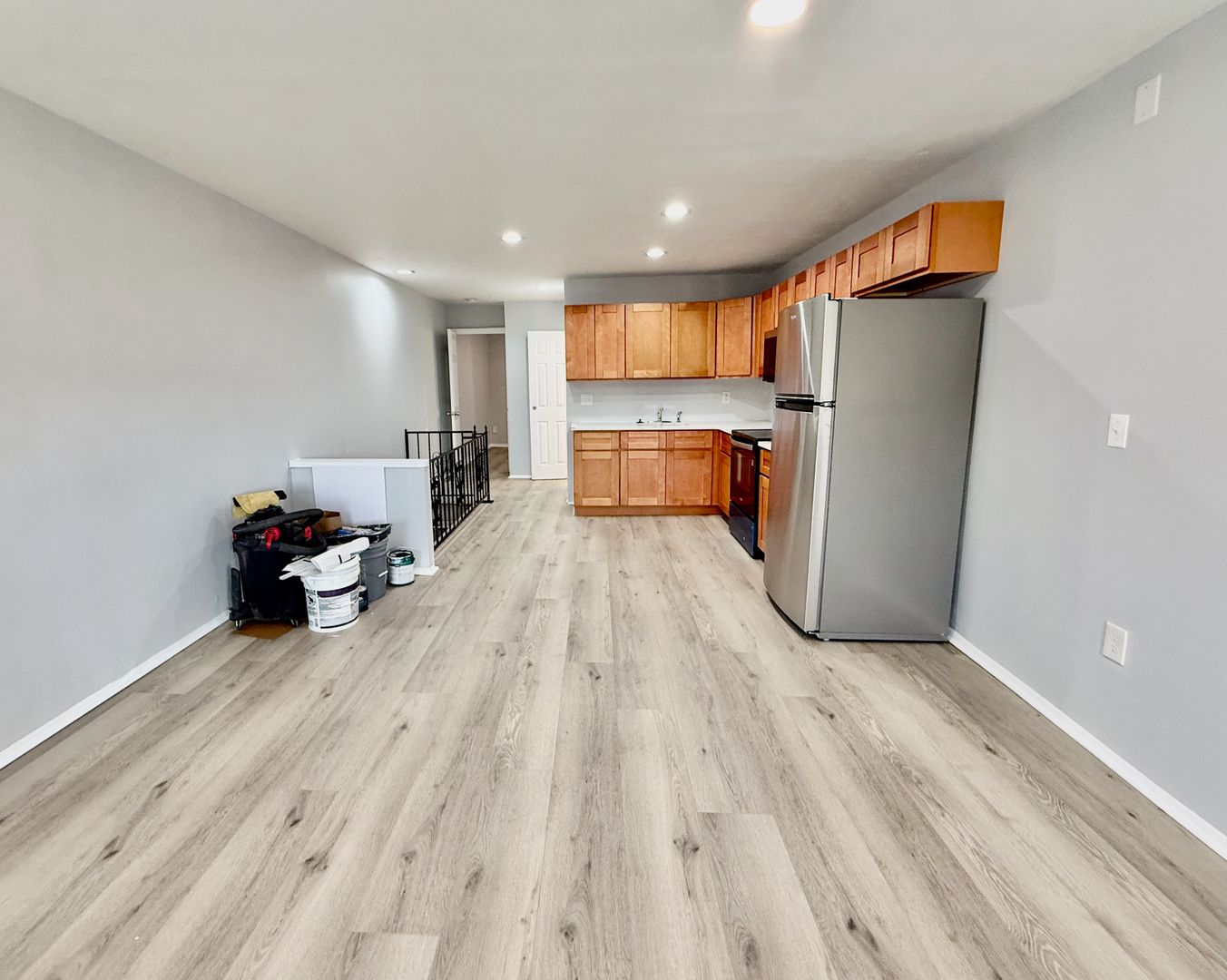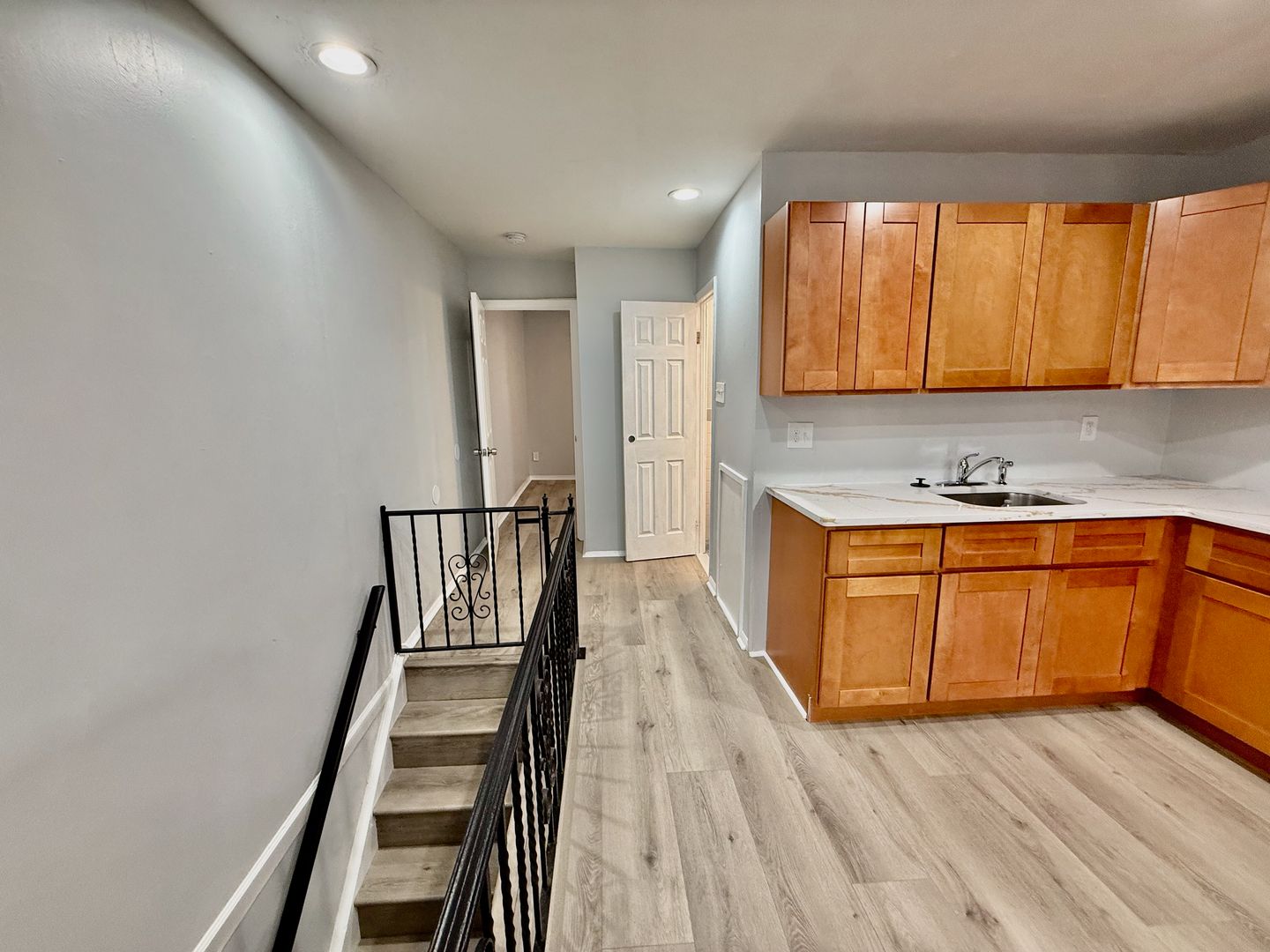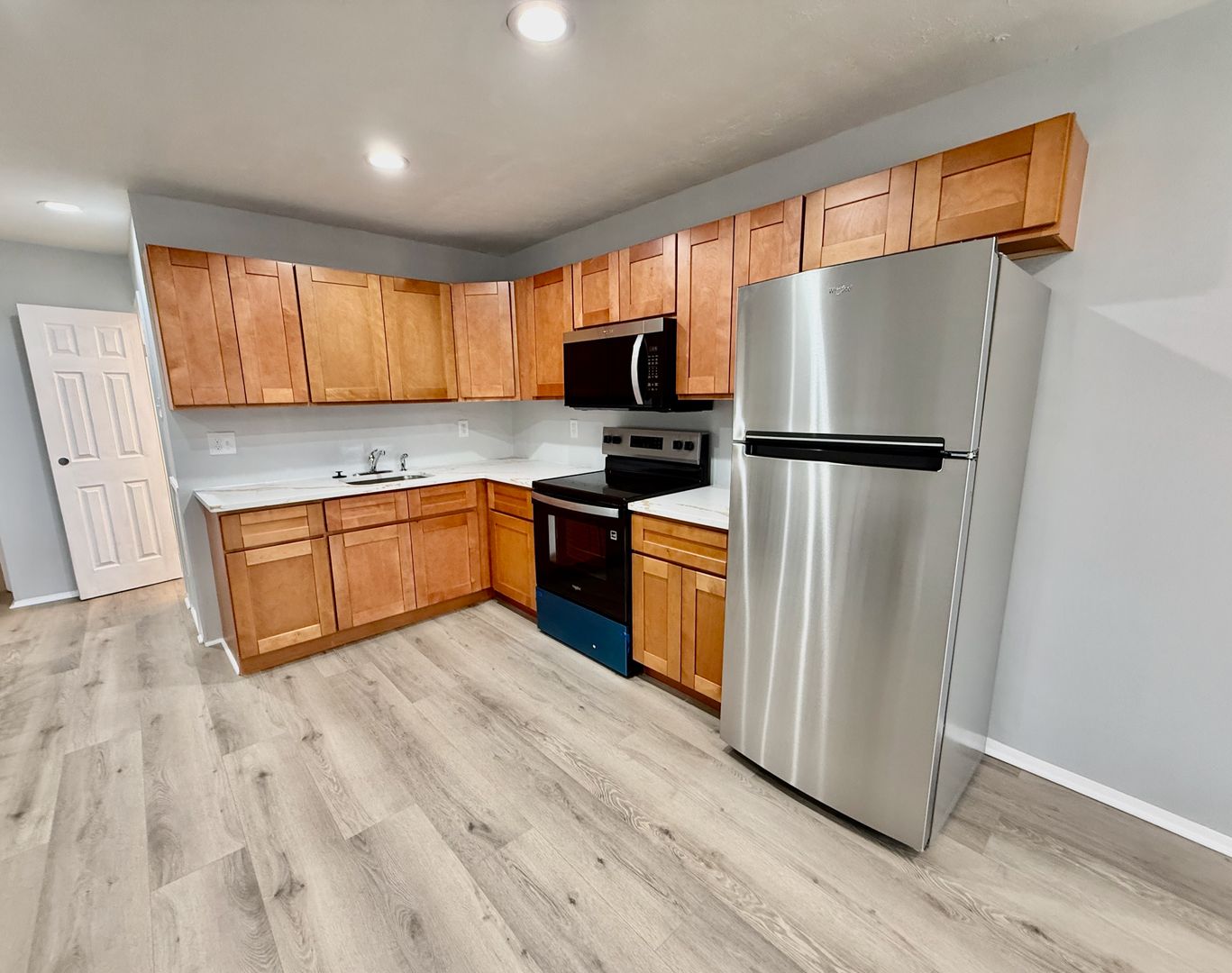 Enter this two unit building, up one flight of stairs to the just renovated, spacious and airy combined living room/dining room & kitchen, freshly painted, with new luxury vinyl flooring throughout, high ceilings, recessed lighting, two large windows with new blinds coming & good natural light, built-in wall ac unit and brand new kitchen featuring quartz countertops, Shaker cabinetry, and Stainless appliances -including refrigerator-electric stove-microwave and undermount sink w/ garbage disposal.