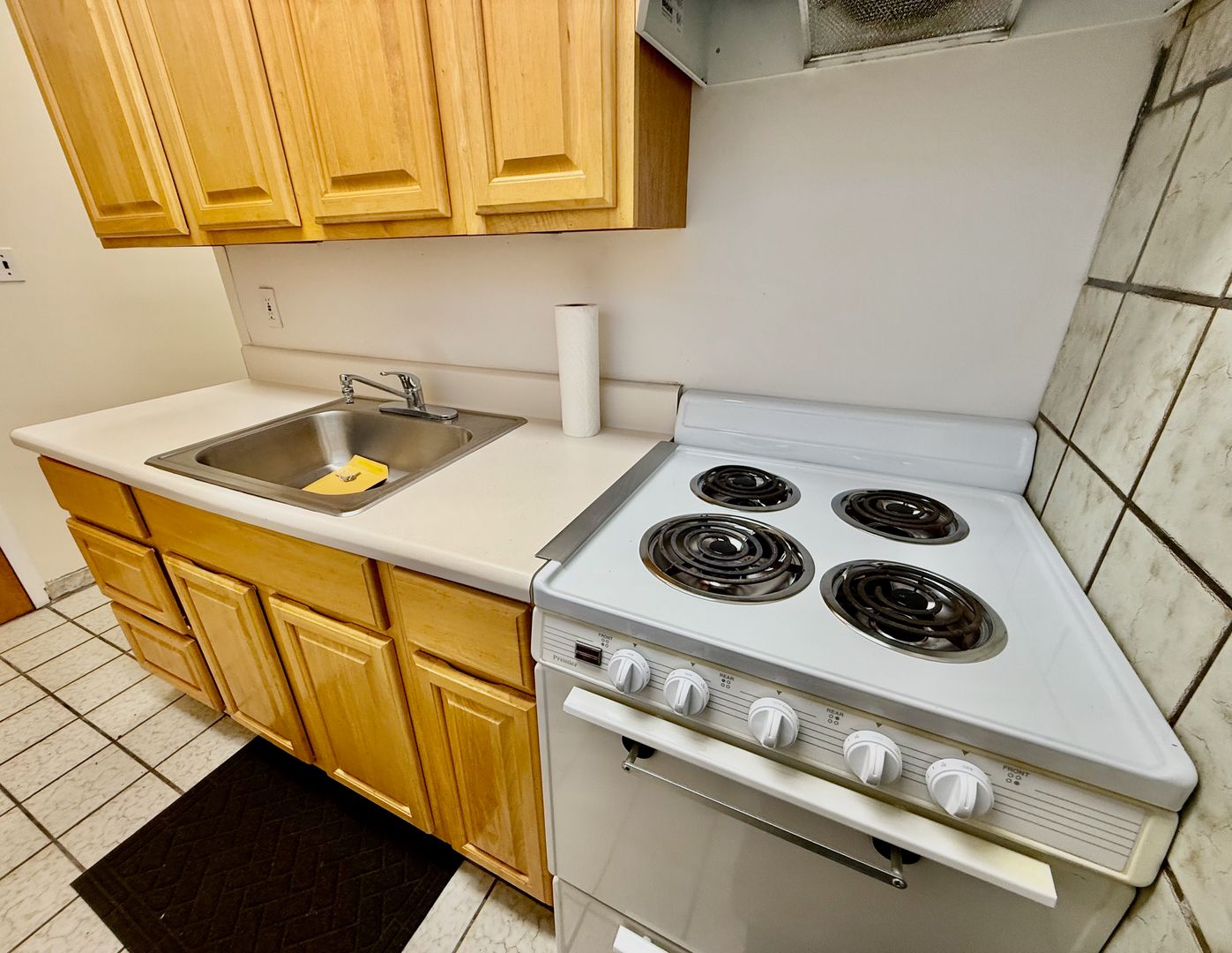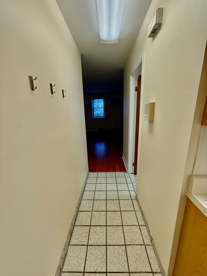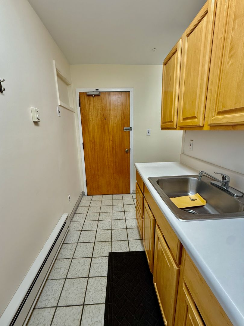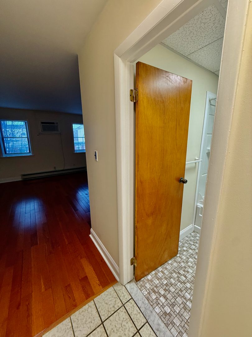 Up 2 flights of carpeted stairs to enter this 3rd floor Studio Apartment with high ceilings, Hardwood & Tile flooring and Kitchen with window and electric stove.