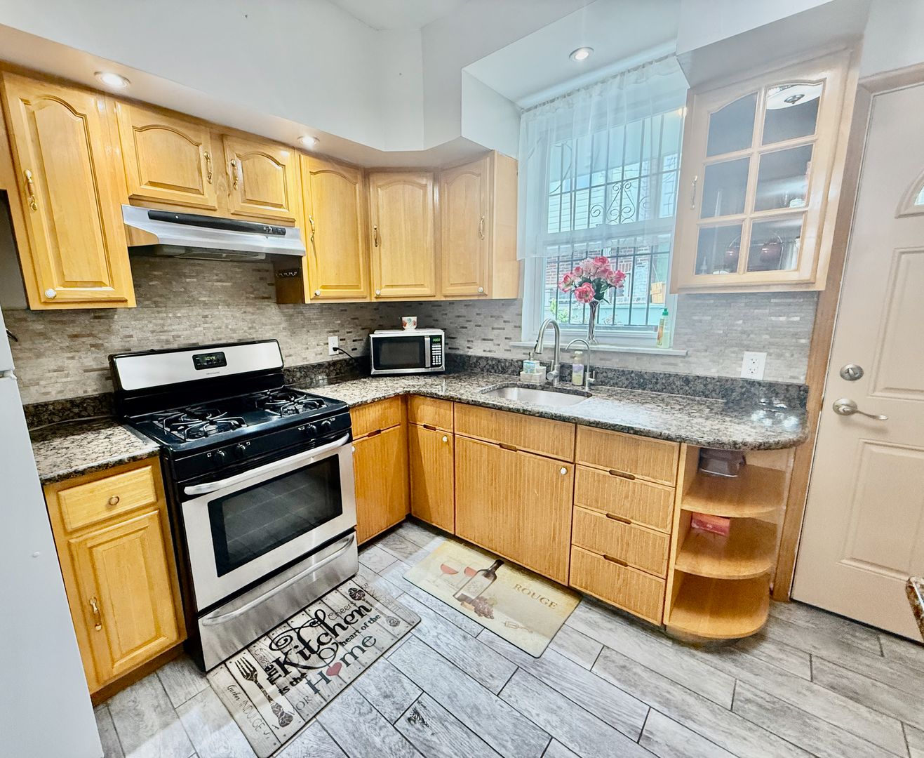 The kitchen features luxury vinyl flooring, granite countertops, plenty of upper & lower wood cabinetry and Appliances including refrigerator, gas range and freestanding microwave. There is even an area for your favorite bottles of vino!