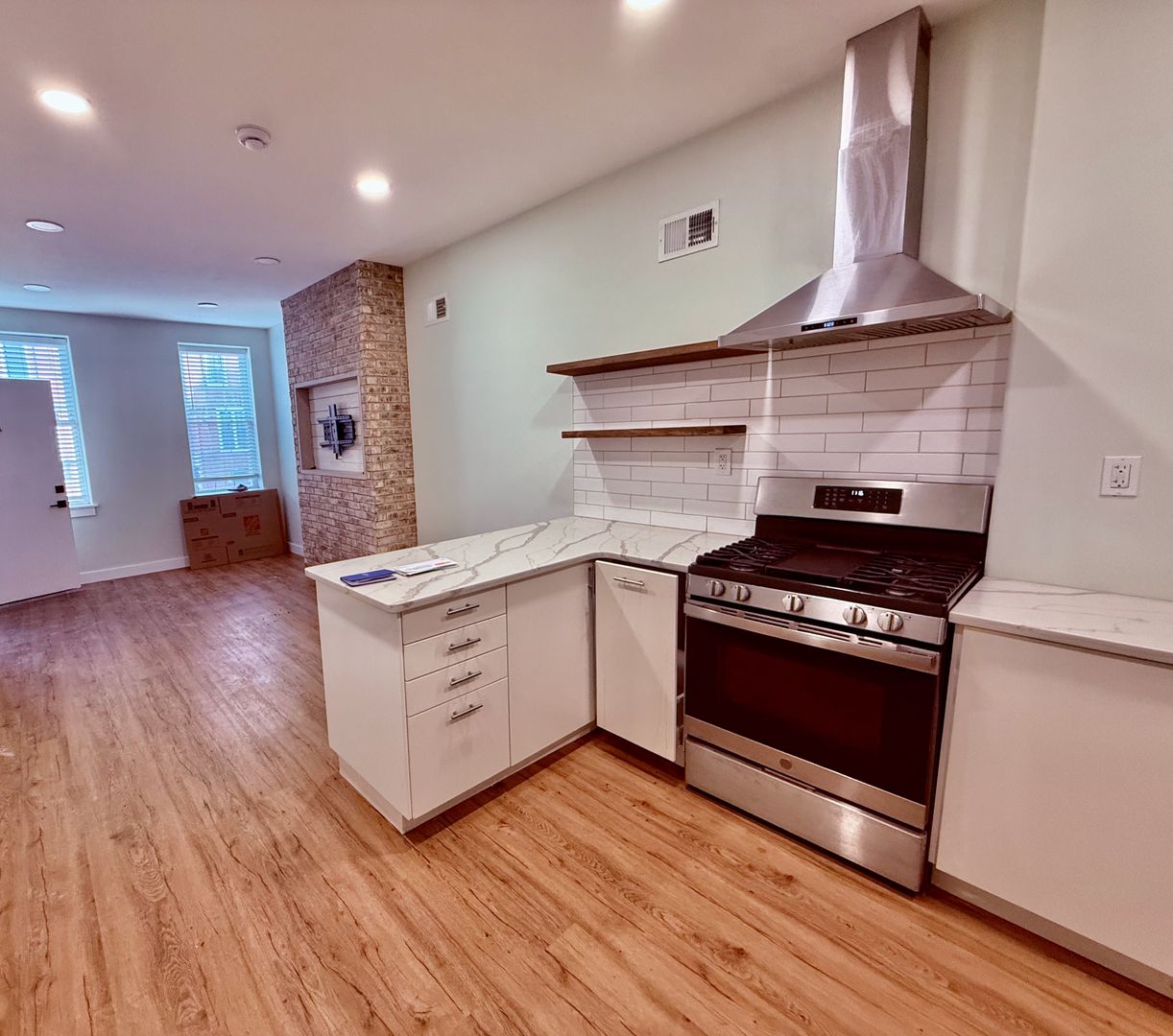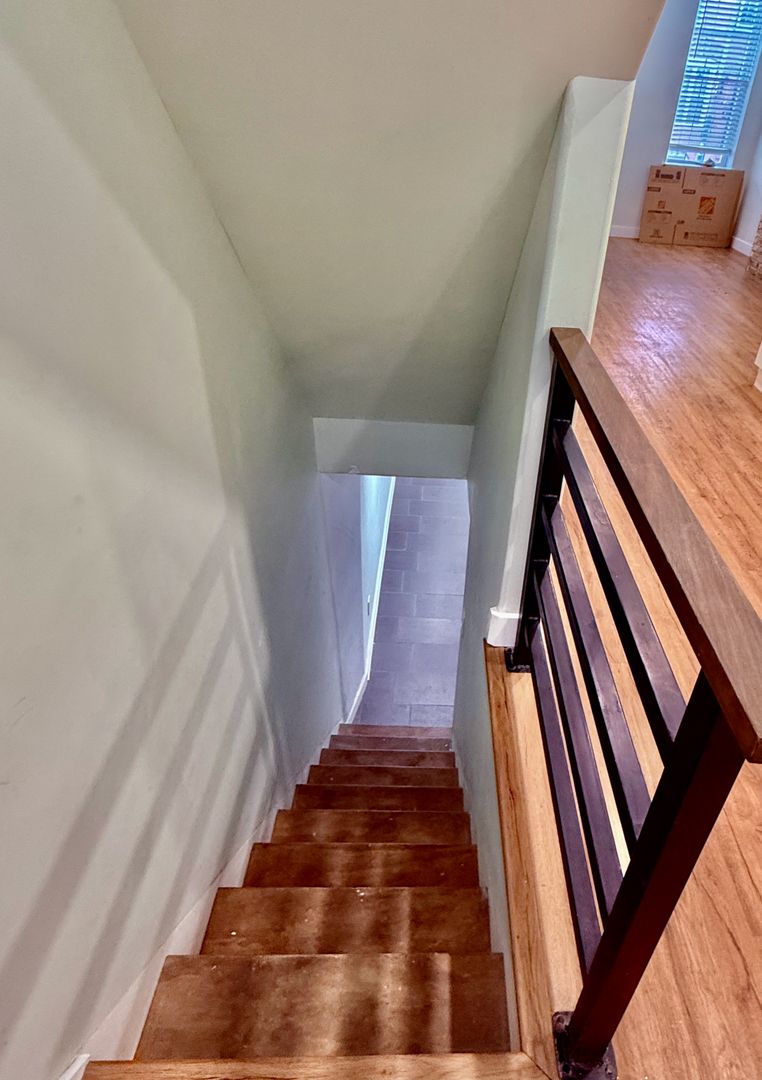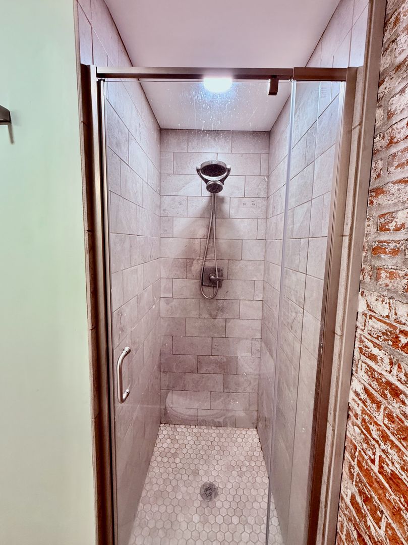 Impeccable newly rehabbed, bi-level apartment featuring 1+ Bedroom/2 Bath Apartment with sophisticated finishes, Central AC, Engineered Wood Flooring, high ceilings, windows w/ blinds and good natural light, quartz countertops, white flat-panel cabinetry, Stainless Appliance Package -refrigerator-gas stove w/ hood-microwave-garbage disposal, full-size washer/dryer, glass enclosed walk-in showers, modern vanities, good closets, thoughtful built-in storage options, space saving barn doors and large rear patio.