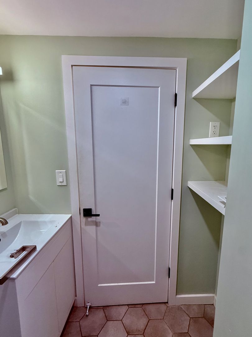Continuing down the center hall is the 1st full Bath with contemporary vanity, built-in shelving and glass-enclosed shower.