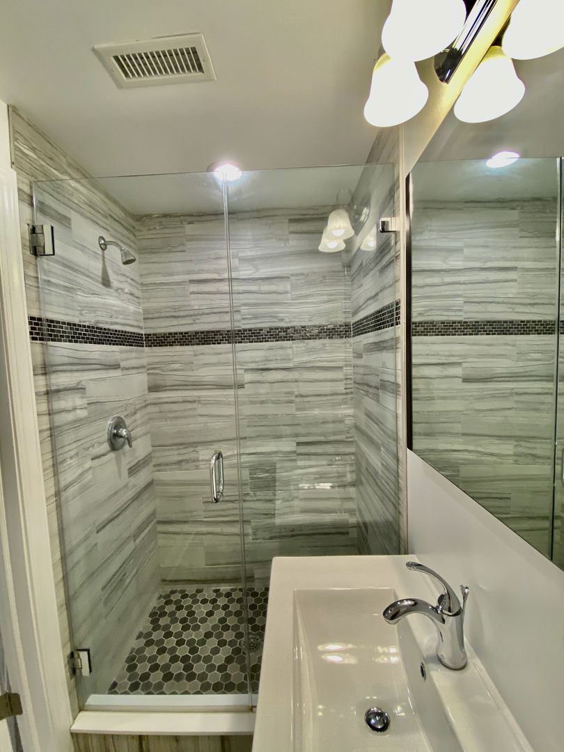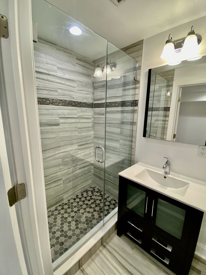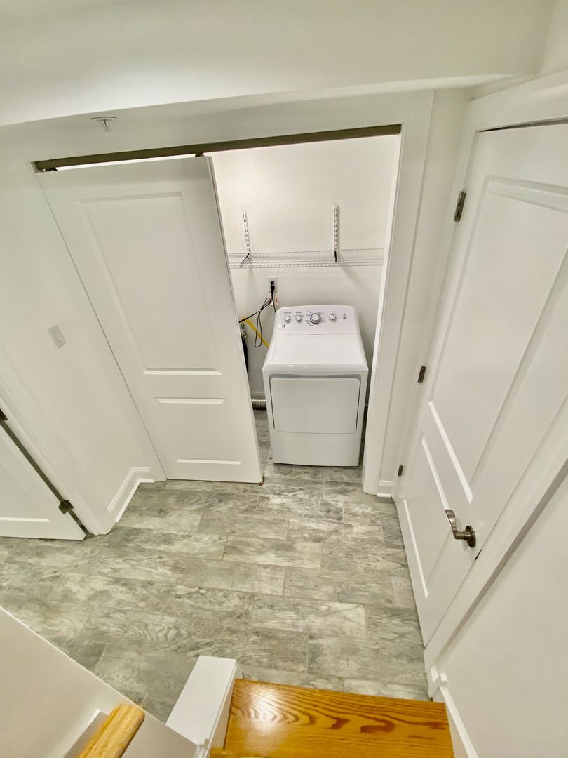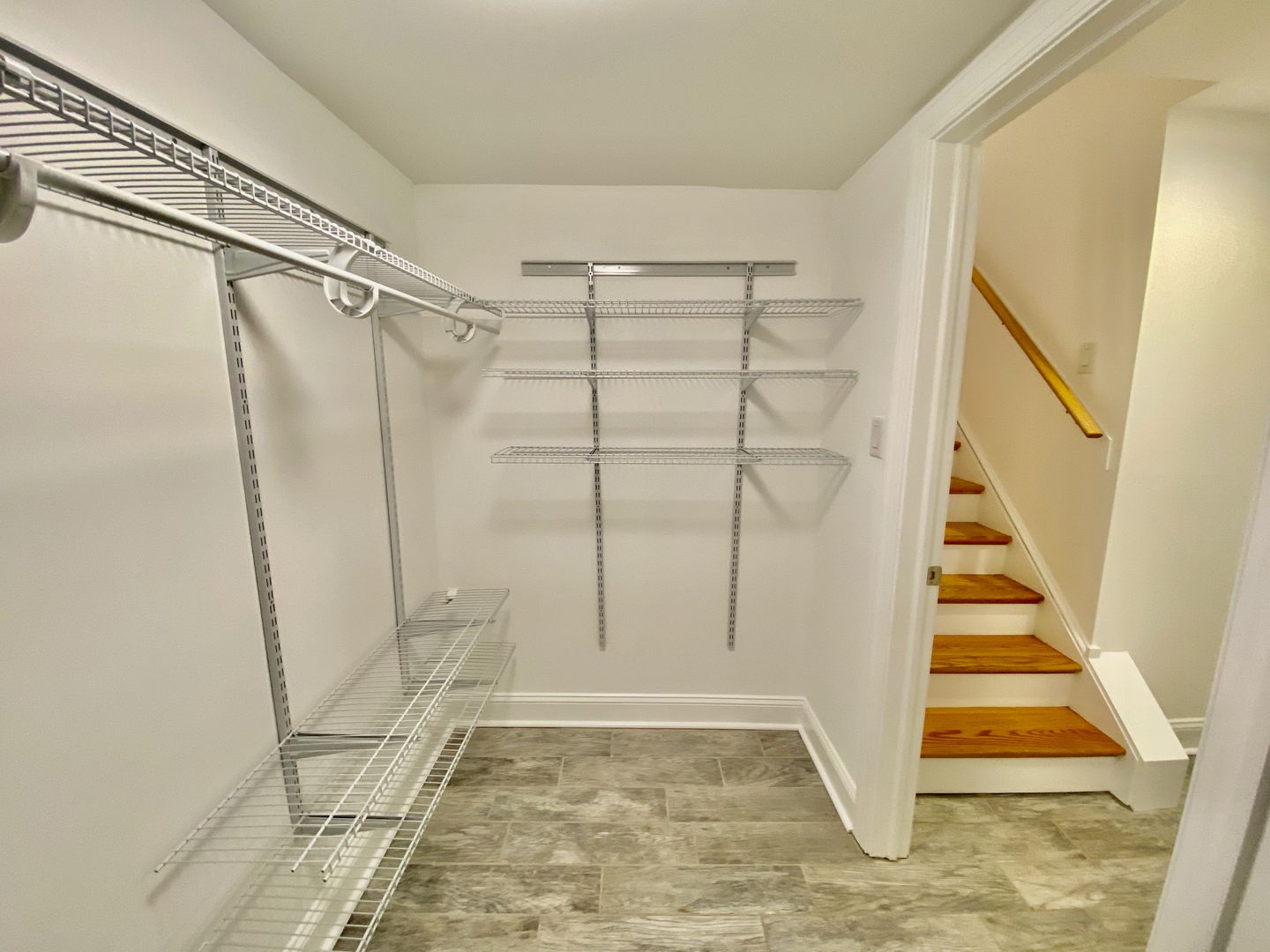 The lower level houses the bedroom, modern bath with glass enclosed shower, fully outfitted closet, additional closets & full washer & dryer/laundry area.