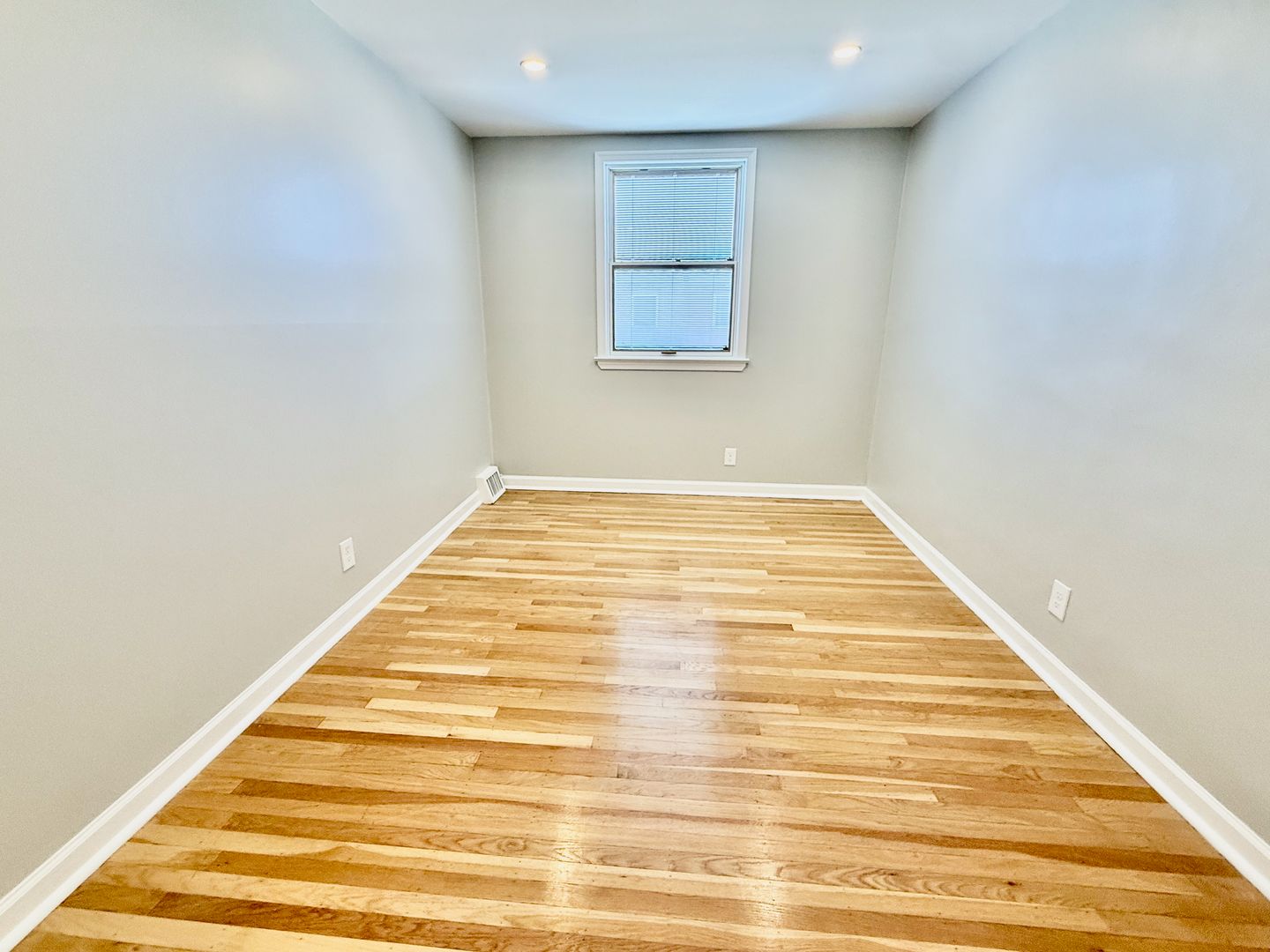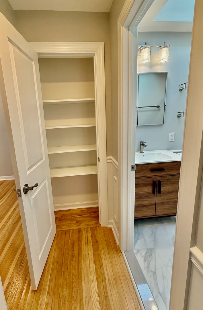 The hardwood stairs, with runner to the second floor, lead to two well-sized bedrooms, with good closets and lots of natural light/blinds, a linen closet and hall bath with skylight, modern vanity and glass-enclosed tub.