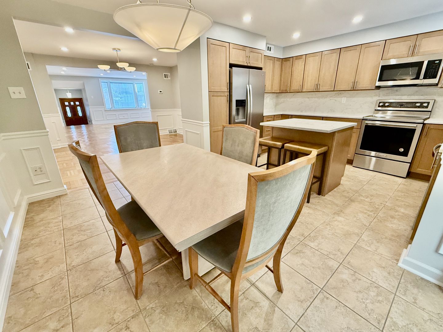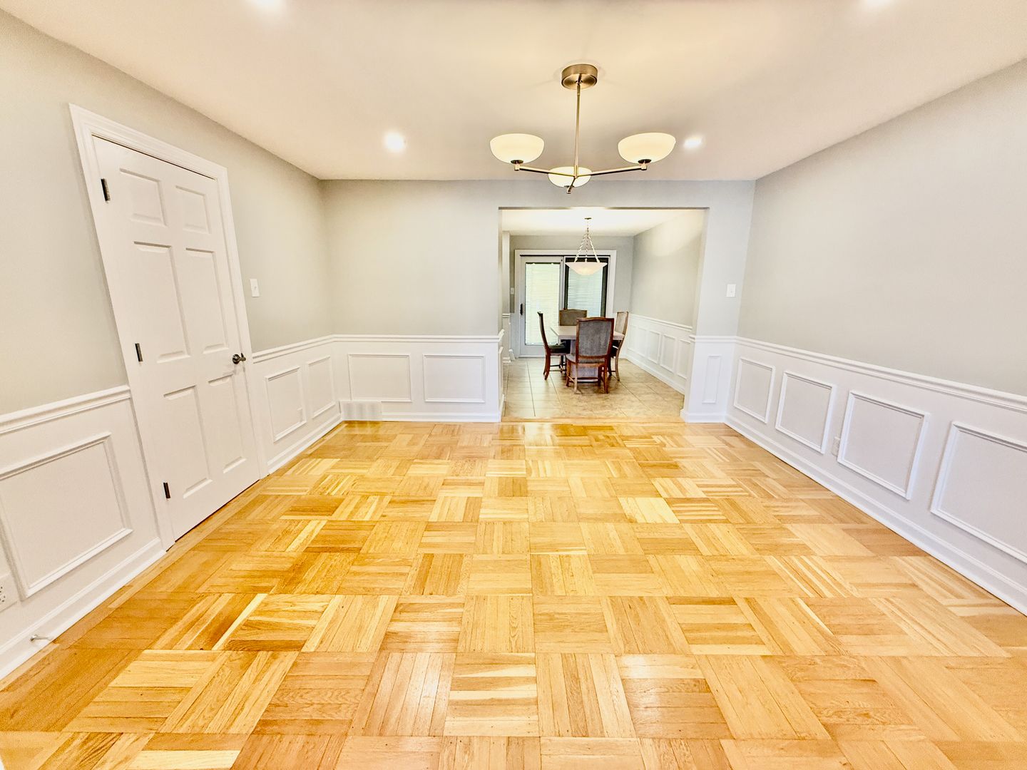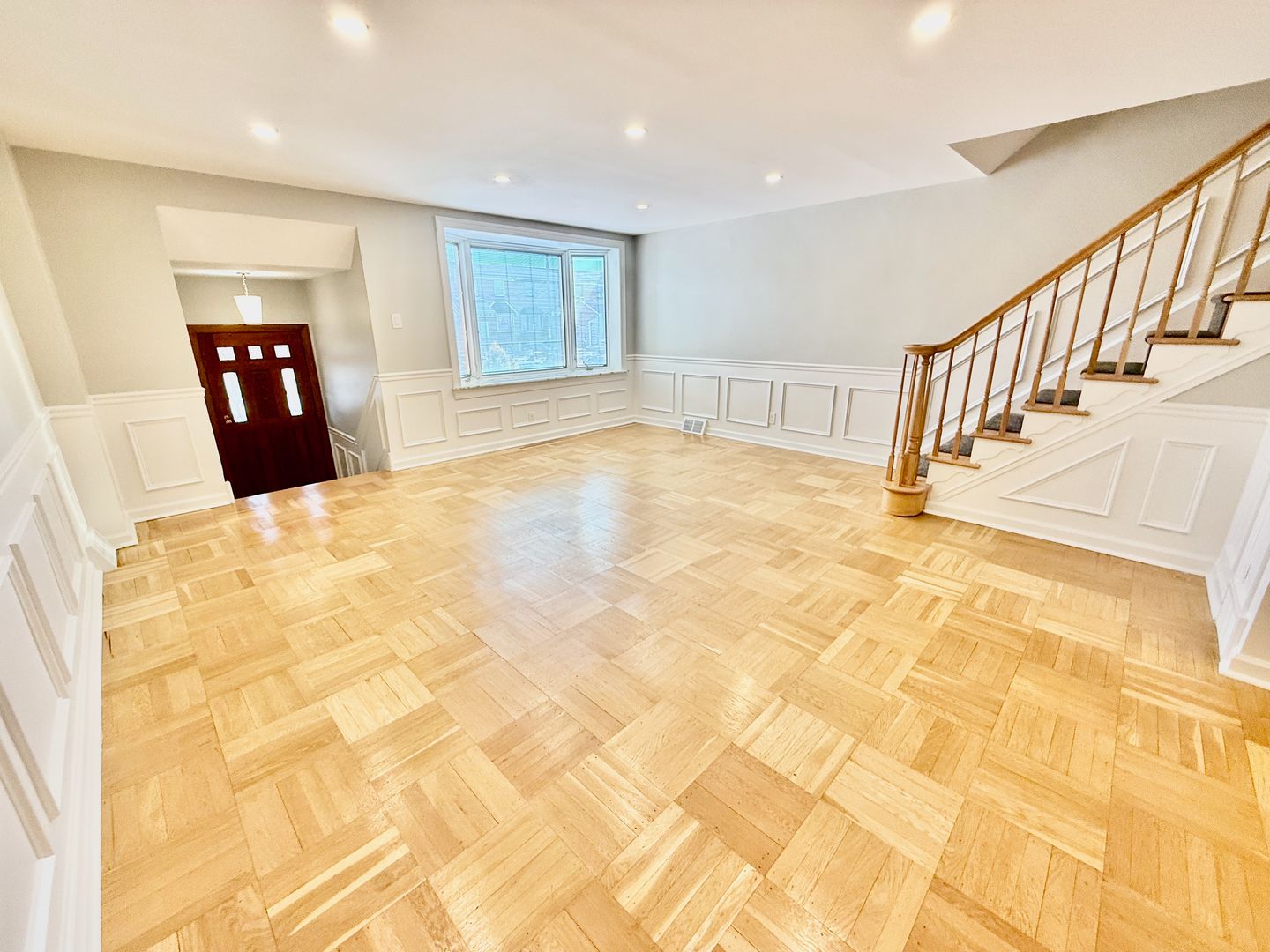 The house opens to a spacious Living Room & separate Dining Room, with Parquet flooring, Panel Molding, high ceilings with recessed lighting, a large sit-in bay window and a spacious layout conducive to a variety of furniture configurations.