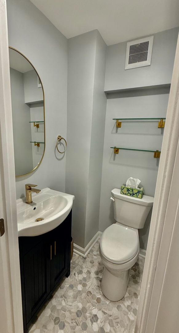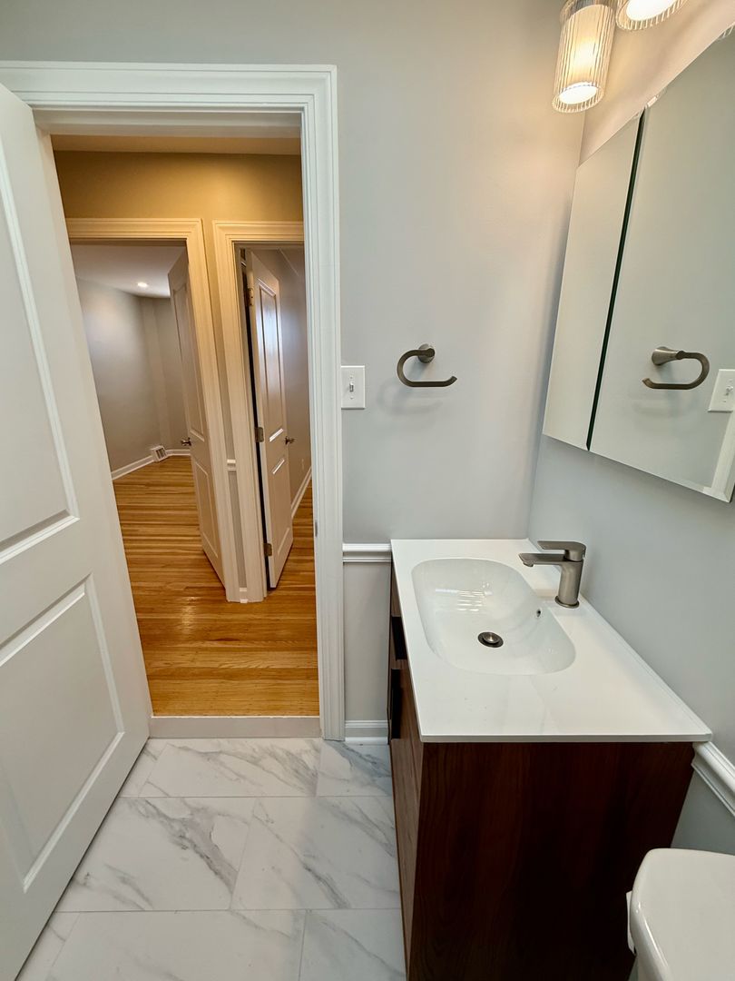 Freshly painted in a soothing muted grey/green, with lots of thoughtful design elements, natural light from numerous windows with blinds, the home has hardwood flooring throughout, with the exception of the kitchen and bathrooms which feature tile flooring, and the finished basement with carpeting.